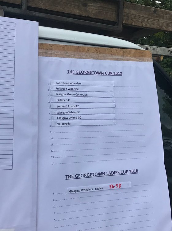 JaneF Posted September 8, 2018 Report Share Posted September 8, 2018 From Geoff Smiths facebook page THE GEORGETOWN CUP 2018 Fullarton Wheelers 2.12.04 Gold Johnstone Wheelers 2.12.39 Silver Glasgow Nightingale 2.12.45 Bronze V C Glasgow South 2.13.43 Glasgow Green CC 2.13.44 Falkirk BC 2.15.15 Ayr Roads CC 2.16.23 Road Club Cumbernauld and Kilsyth 2.16.40 Inverclyde Velo 2.17.47 Lomond Roads 2.20.57 Glasgow Wheelers 2.25.00 Law Wheelers 2.26.18 Glasgow United 2.29.30 Velopreda 2.31.47 Georgetown Pie The Georgetown Ladies Cup 2018 Stirling Bike Club 56.25 Gold Glasgow Wheelers 56.58 Silver Falkirk BC 40.45 (only 2) Bronze Law Wheelers 44.25 (only 2) The Flying Scot Race 2018 Colin Sergeant, Law Wheelers 17.08 Gold Steve Donaldson, Fullarton Wheelers 21.28 Silver Ted Mullen, Velopreda 22.02 Bronze Wilma Philips, Law Wheelers 22.13 Fastest Lady Barry Marshall, Velopreda 22.16 Alexander McCulley, Falkirk BC 23.15 RECORD ATTEMPT Douglas Watson, GTR - Return to Life 15.56 New All Comers Flying Scot Record 1 09:01 Ian Loughran Velopreda 00:20:15 2 09:02 Barry Marshall (FS) Velopreda 00:23:16 3 09:03 Douglas Stevenson Velopreda 00:18:09 4 09:04 Ian Martin Velopreda 00:19:19 5 09:05 Edward Mullen (FS) Velopreda 00:22:01 6 09:06 Paul Keir Velopreda 00:19:26 7 09:07 Euan Walker Velopreda 00:18:23 8 09:08 John Leonard Velopreda 00:17:15 9 09:09 Andrew Mcghee Velopreda 00:16:59 10 09:10 Mirjam Allik Glasgow Wheelers 00:19:04 11 09:11 Elizabeth Wisdish Glasgow Wheelers 00:19:48 12 09:12 Radoslaw Rachwal Glasgow Wheelers 00:18:27 13 09:13 Fiona Cockburn Glasgow Wheelers 00:18:29 14 09:14 Deirdre O'reilly Glasgow Wheelers 00:19:25 15 09:15 Neil Griffiths Glasgow Wheelers 00:16:35 16 09:16 Harry Tweed Glasgow Wheelers 00:17:53 17 09:17 Graeme Muir Glasgow Wheelers 00:17:00 18 09:18 William Munro Glasgow Wheelers 00:18:07 19 09:19 Ronald Difelice Glasgow Couriers 00:18:55 20 09:20 Alan Linstead Glasgow Couriers 00:18:18 21 09:21 Scott Newman Glasgow Couriers 00:16:09 22 09:22 Stephen Hill Lomond Roads CC 00:17:07 23 09:23 Richard Burchmore Lomond Roads CC 00:19:03 24 09:24 Brian Lafferty Lomond Roads CC 00:17:56 25 09:25 Douglas Dorrington Lomond Roads CC 00:18:29 26 09:26 Chris Brown Lomond Roads CC 00:17:43 27 09:27 Peter Dorrington Lomond Roads CC 00:17:15 28 09:28 Graeme Daly Lomond Roads CC 00:18:18 29 09:29 Brian Cameron Lomond Roads CC dns 30 09:30 David Barclay Lomond Roads CC 00:17:29 31 09:31 Gordon Dick Lomond Roads CC 00:16:40 32 09:32 Janette Hazlett Glasgow Ivy CC 00:19:49 33 09:33 David Ross Falkirk B C 00:15:51 34 09:34 Claire Davidson Falkirk B C 00:20:40 35 09:35 Blair Martin Falkirk B C 00:18:33 36 09:36 Diana Macgregor Falkirk B C 00:20:15 37 09:37 Mark Donaldson Falkirk B C 00:17:09 38 09:38 Gerry Robertson Falkirk B C 00:18:36 39 09:39 Bruce Fullerton Falkirk B C 00:19:37 40 09:40 Alexander Mcculley (FS) Falkirk B C 00:23:15 41 09:41 Ian Conn Falkirk B C 00:20:24 42 09:42 William Turner Falkirk B C 00:17:15 43 09:43 Stephen Makin Falkirk B C 00:16:58 44 09:44 Murray Ferguson Falkirk B C 00:16:20 45 09:45 Joe Shaw Falkirk B C 00:17:50 46 09:46 Stuart Grady Falkirk B C 00:17:00 47 09:47 Ian Macgregor Falkirk B C 00:16:52 48 09:48 Robert Hutchison Falkirk B C 00:18:43 49 09:49 Robin Mullin Falkirk B C 00:19:40 50 09:50 Douglas Macdonald Fullarton Wheelers 00:18:13 51 09:51 Steve Donaldson Fullarton Wheelers 00:21:28 52 09:52 Alistair Kinnaird Fullarton Wheelers 00:17:20 53 09:53 Alan Mccall Fullarton Wheelers 00:17:40 54 09:54 John Todd Fullarton Wheelers 00:18:14 55 09:55 Scott-alexander Mckendrick Fullarton Wheelers 00:18:19 56 09:56 Peter Mclardy Fullarton Wheelers dns 57 09:57 Guy Walker Fullarton Wheelers 00:19:10 58 09:58 Stevie Watters Fullarton Wheelers 00:17:02 59 09:59 Sean Barron Fullarton Wheelers 00:17:32 60 10:00 Frazer Bell Fullarton Wheelers dns 61 10:01 Derek Skinner Fullarton Wheelers 00:16:49 62 10:02 Allan Duncan Fullarton Wheelers 00:16:33 63 10:03 James Ryland Fullarton Wheelers 00:16:27 64 10:04 Gordon Stead Fullarton Wheelers 00:16:13 65 10:05 Christopher Staples Fullarton Wheelers 00:16:20 66 10:06 Gordon Graham Fullarton Wheelers 00:16:04 67 10:07 Darren Kean Fullarton Wheelers 00:16:36 68 10:08 Allan Clark Glasgow United CC 00:21:24 69 10:09 Scott Macpherson Glasgow United CC 00:18:22 70 10:10 Ian Hepburn Glasgow United CC 00:20:39 71 10:11 Alasdair Mcalpine Glasgow United CC 00:17:45 72 10:12 John Mcaliece Glasgow United CC 00:17:53 73 10:13 Richard Macpherson Glasgow United CC 00:16:58 74 10:14 John Mccrory Glasgow United CC 00:16:50 75 10:15 Mark Daly Glasgow United CC 00:19:39 76 10:16 Liam White Glasgow Green Cycle Club 00:16:46 77 10:17 Iain Martin Glasgow Green Cycle Club 00:17:48 78 10:18 Murray Soutter Glasgow Green Cycle Club 00:16:45 79 10:19 Joseph Cotton Glasgow Green Cycle Club 00:18:40 80 10:20 Kieron Redmond Glasgow Green Cycle Club 00:15:58 81 10:21 Stephen Malaney Glasgow Couriers 00:18:52 82 10:22 David Sykes Glasgow Green Cycle Club 00:21:20 83 10:23 Derek Brown Glasgow Green Cycle Club 00:18:23 84 10:24 Martin Godfrey Glasgow Green Cycle Club dns 85 10:25 Michael Mcpartlin Glasgow Green Cycle Club 00:17:26 86 10:26 Alan Clark Glasgow Green Cycle Club 00:17:11 87 10:27 Michael Gaddis Glasgow Green Cycle Club dns 88 10:28 Calum Mcvie Glasgow Green Cycle Club 00:16:26 89 10:29 Andy Jack Glasgow Green Cycle Club 00:18:46 90 10:30 Gavin Morton Glasgow Green Cycle Club 00:17:33 91 10:31 David Mcgill Glasgow Green Cycle Club 00:16:44 92 10:32 Craig Ross Glasgow Green Cycle Club 00:17:10 93 10:33 Darren Carruthers Glasgow Green Cycle Club 00:16:44 94 10:34 William Hinshelwood Glasgow Green Cycle Club 00:17:14 95 10:35 Ian Mcginty Johnstone Wheelers 00:17:29 96 10:36 Graham Findlay Johnstone Wheelers 00:16:40 97 10:37 John Clark Gerard Deeley (T) Johnstone Wheelers 00:17:46 98 10:38 Mike Ferguson Johnstone Wheelers 00:18:53 99 10:39 Alan Thomson Johnstone Wheelers 00:17:53 100 10:40 Scott Mcintosh Johnstone Wheelers 00:18:02 101 10:41 Iain Mctavis